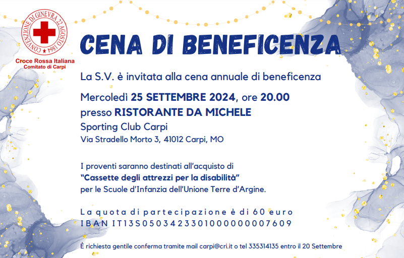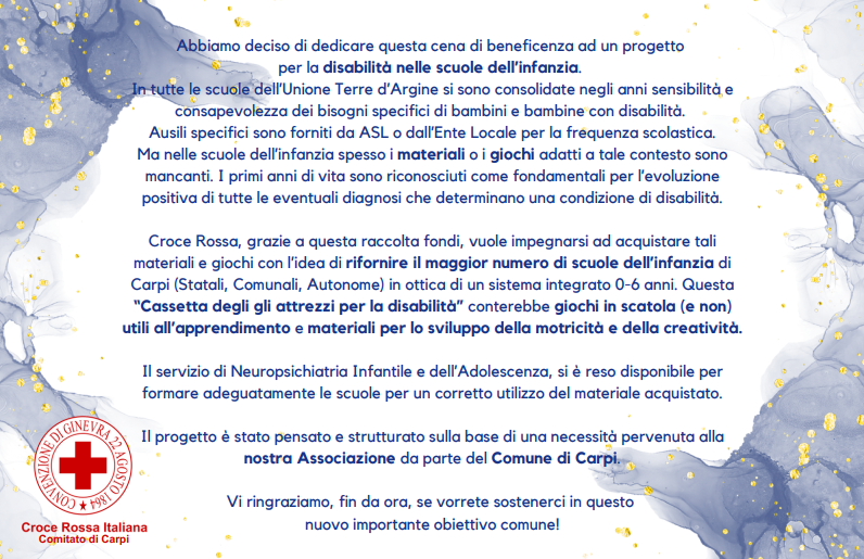 Per questo secondo anno riproponiamo questa cena al costo complessivo di €60,00 a testa (cena + quota di beneficienza) con lo scopo di donare il maggior numero di “cassette degli attrezzi per la disabilità” alle scuole del territorio.
