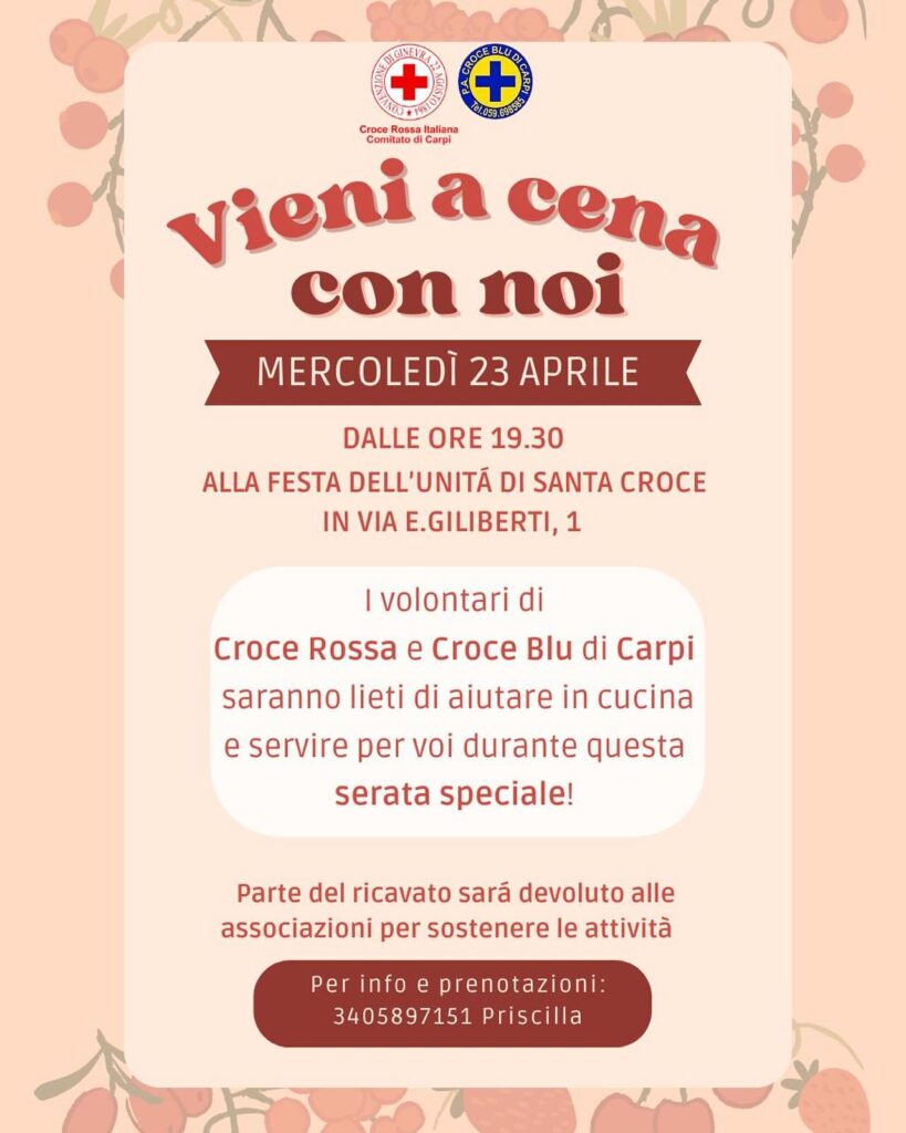 VIENI A CENA CON NOI? I nostri volontari insieme a quelli della Croceblucarpi saranno lieti di aiutare in cucina e servire per voi durante questa serata speciale!