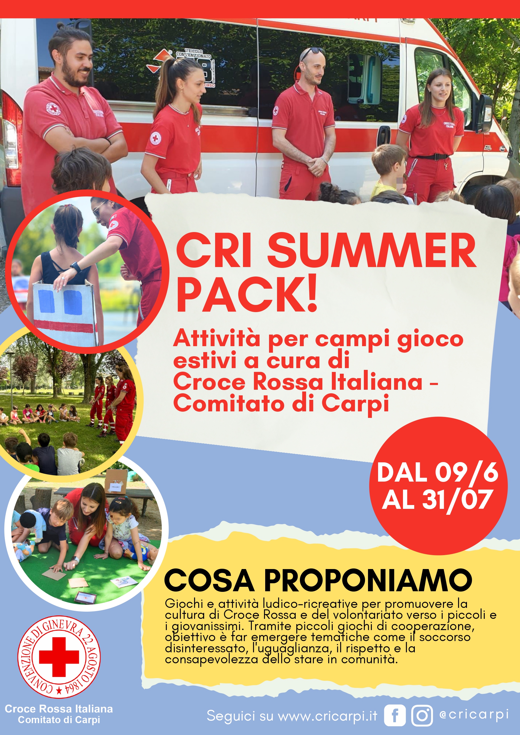 CRI SUMMER PACK Il progetto per portare Croce Rossa nei centri estivi attraverso attività, giochi e incontri. Attività suddivise per fasce di età e con l’obiettivo di far scoprire il mondo del Volontariato e di Croce Rossa ai più piccoli, giocando e divertendosi! Sei un centro estivo interessato a partecipare? Manda una mail a carpi.giovani@emiliaromagna.cri.it Alcune foto delle attività già realizzate Precedente Successivo Scarica il PDF con le info complete CRI SUMMER PACK 118.90 KB 9 downloads ... Download
